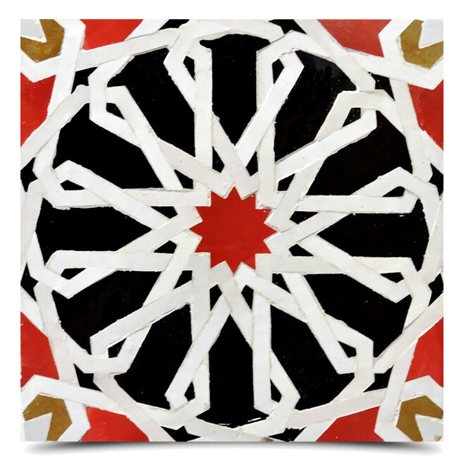 Asala is a vibrant and energetic mosaic tile that incorporates Moroccan traditional culture. Its red, white, blue, yellow, black, orange, and yellow colors offer a unique style and lively vibe. Its complex pattern will awaken any room—the ideas are endless. Asala embodies the beauty of life and Moroccan culture, and will bring love and hope to your home.
