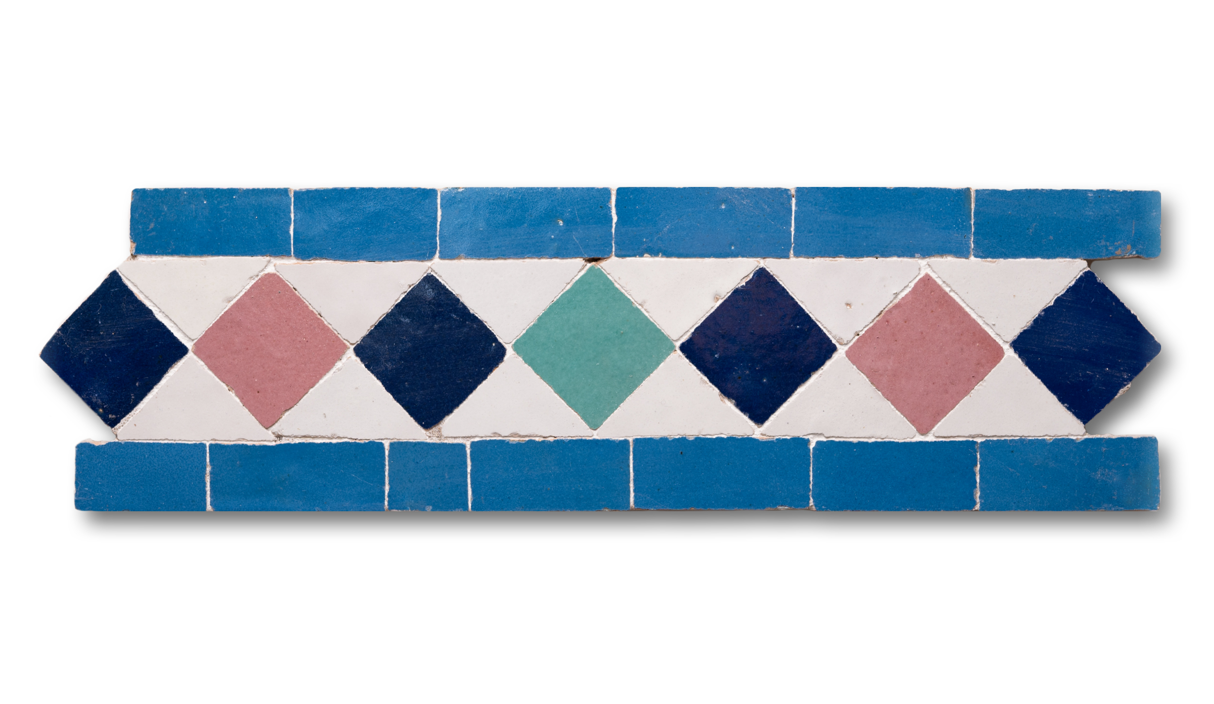 Dama offers a lovely diamond pattern in blue, pink and seafoam green. Its bright blue border provides a soft finishing touch to this design. Highlight this Moroccan border with our solid color mosaics.