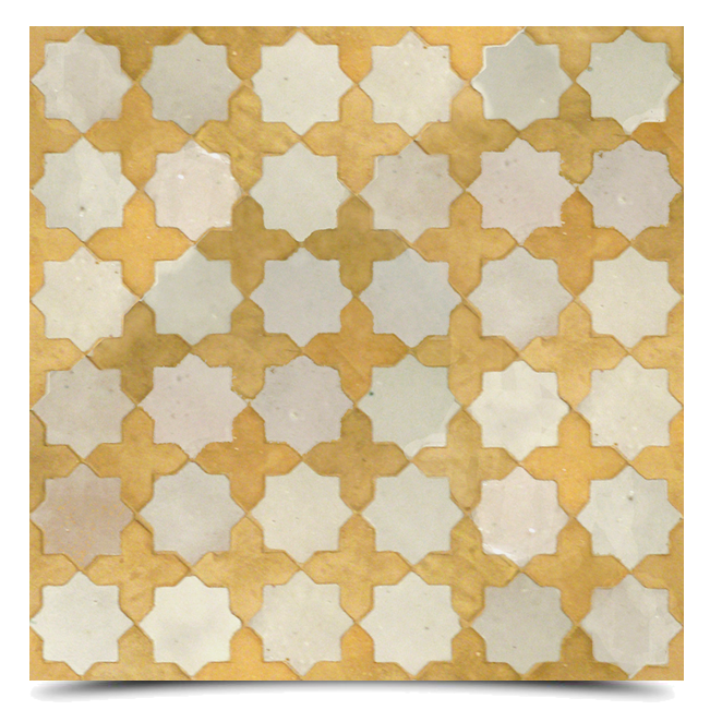 Tanaya is mosaic pattern featuring rows of stars and moorish crosses. Its grey and gold tone colors create a beautiful regal look. Its temple of beauty will complement any room. Tanaya will add a rustic feeling to your home.