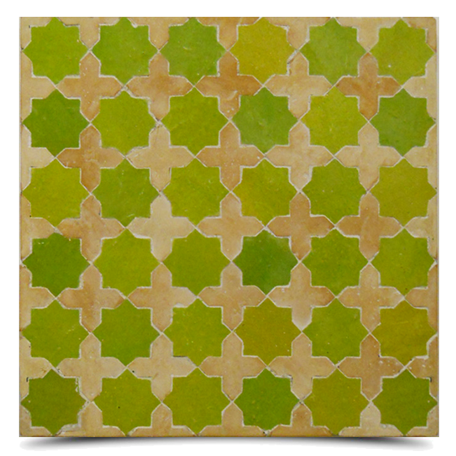 Tanaya is mosaic pattern featuring rows of stars and moorish crosses. Its green and gold tone colors create a unique and bright look. Its temple of beauty will complement any room. Tanaya will add a rustic feeling to your home.